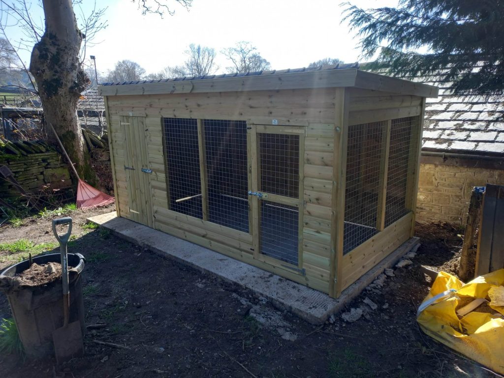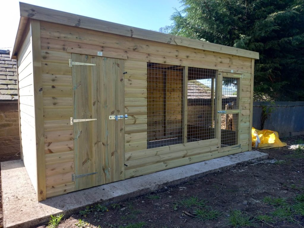 Our dog kennel and run offers an internal kennel area with two access doors and a run area. The run area has no floor, making it easy to clean out and has a galvanised mesh front. The building can be manufactured in 12mm shiplap cladding or 16mm loglap cladding.