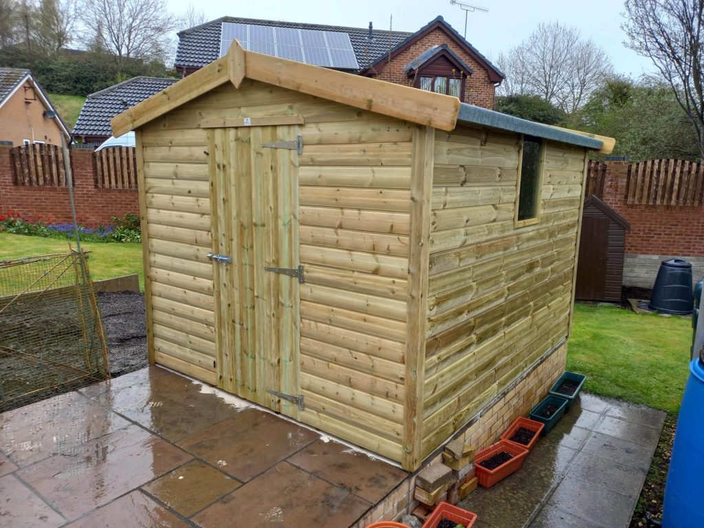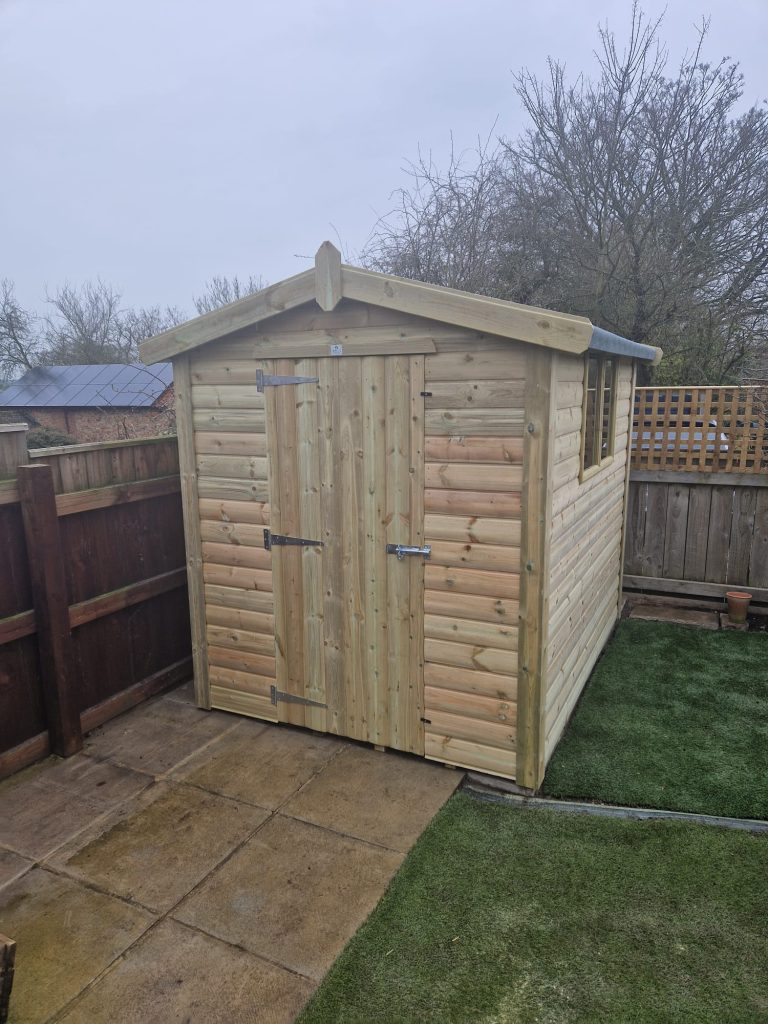 Our budget tanalised sheds come with full either 12mm shiplap or 16mm loglap cladding, Joinery made windows, fully framed door, 2”x1” framework, T-Hinges & Slide bolt lock, Apex roof and Tanalith E Treatment.