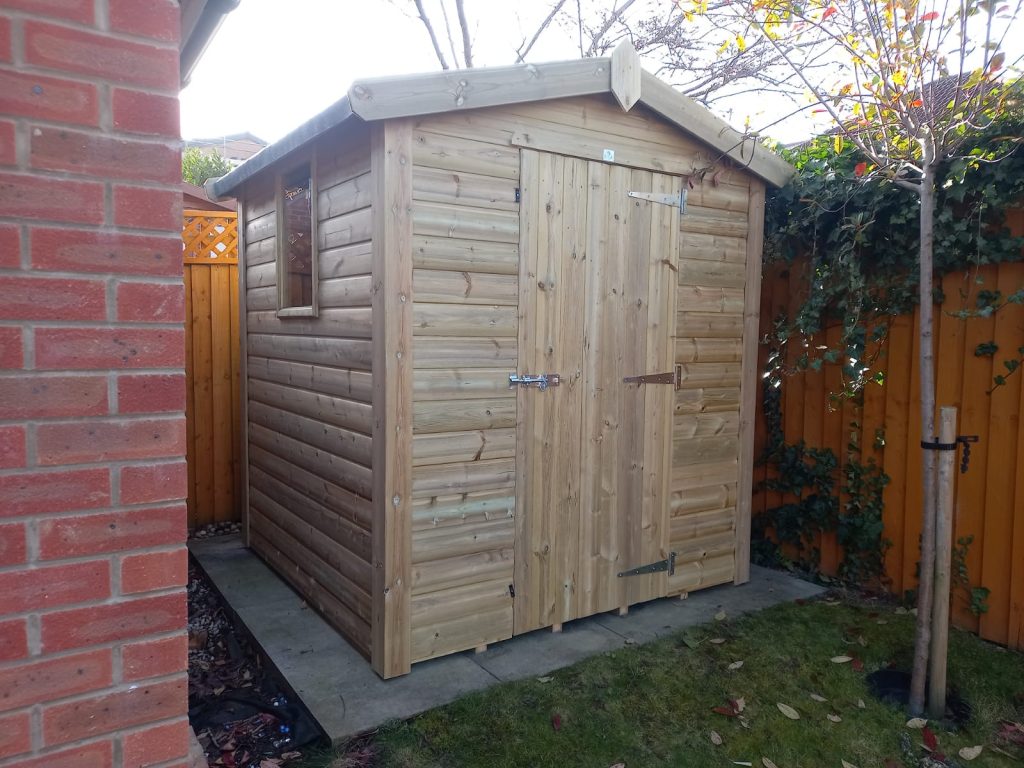 A traditional style garden shed with an apex roof manufactured using fully tanalised tongue and groove timber throughout and 2”x